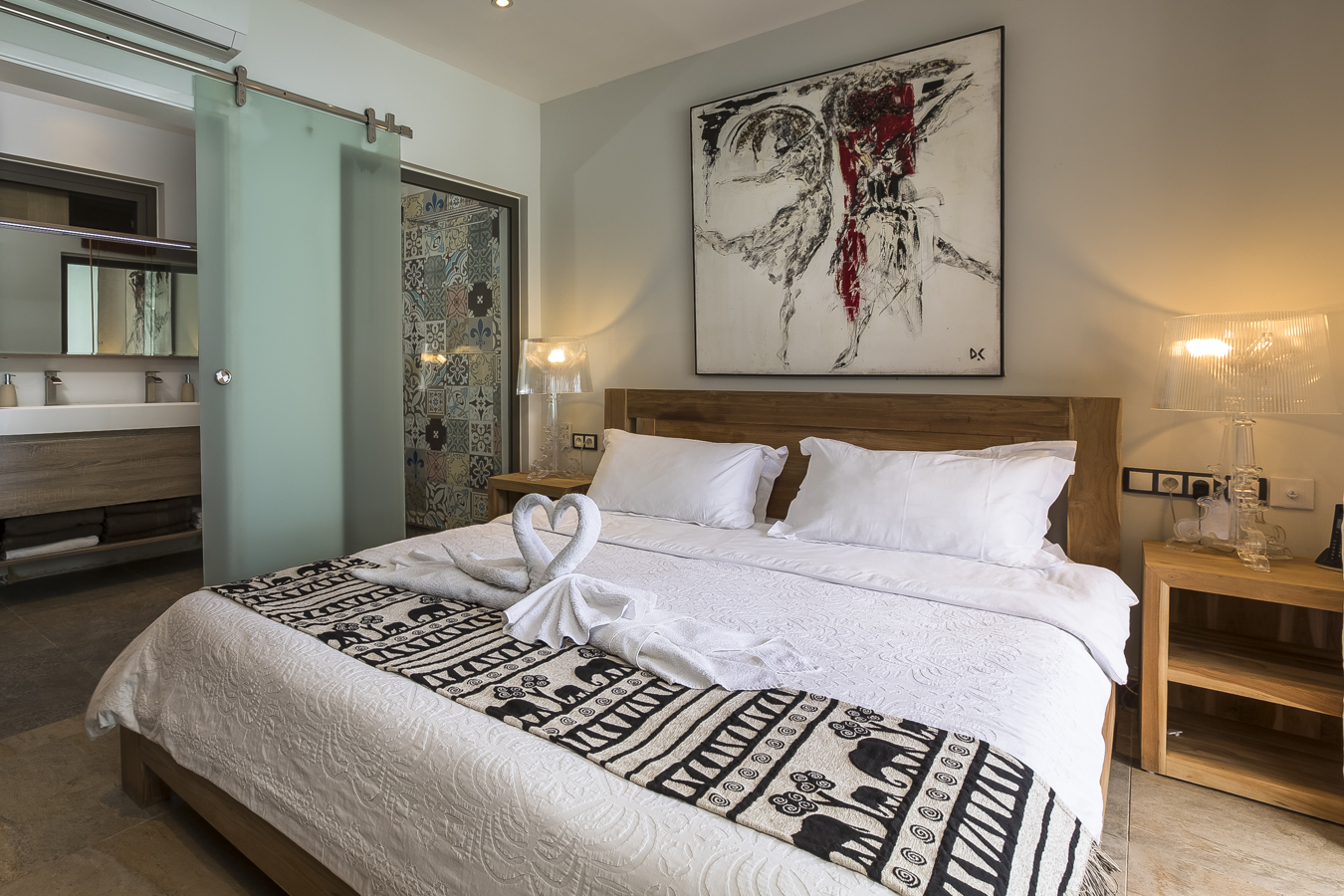 The master bedroom is en-suite and leads directly to a comfortable outdoor lounge on the terrace. The second bedroom with a double bed leads directly to a little private terrace that will be the perfect place to read a good book. The third bedroom at the back has also a double bed and shares the bathroom with the second bedroom.