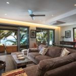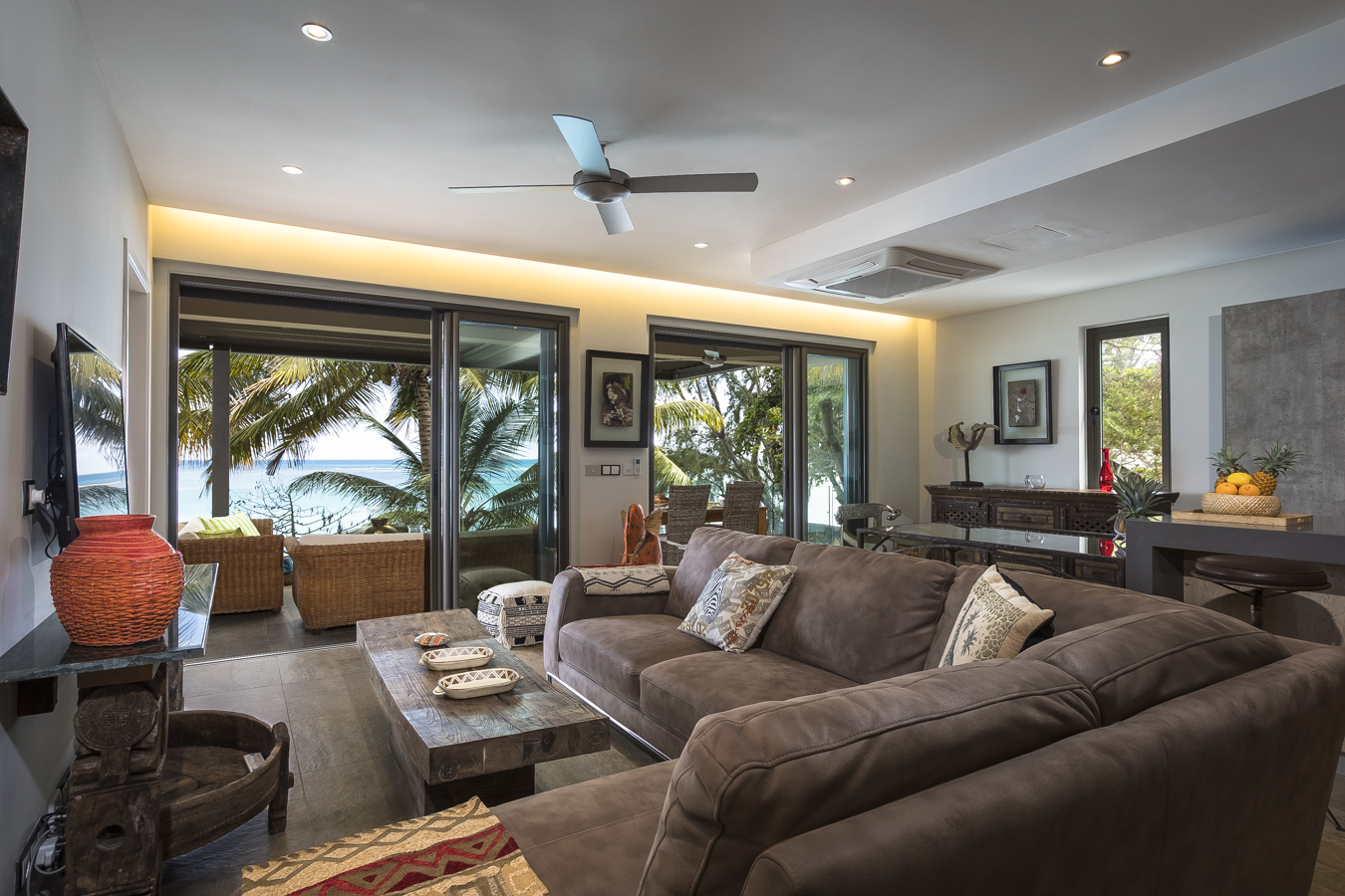 The living room, furnished and tastefully decorated, consists of a large comfortable living room with television, a small dining table and an open kitchen. Open the large sliding doors and enjoy the terrace and the breathtaking view over the Indian Ocean. Ideal for relaxing on a warm and sunny day or a drink in the evening with your loved ones.