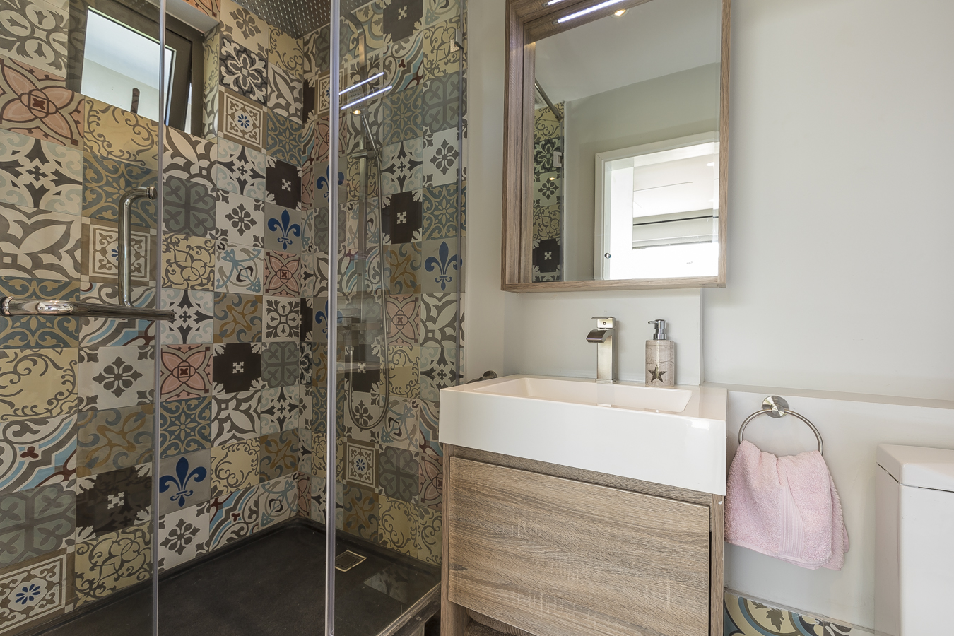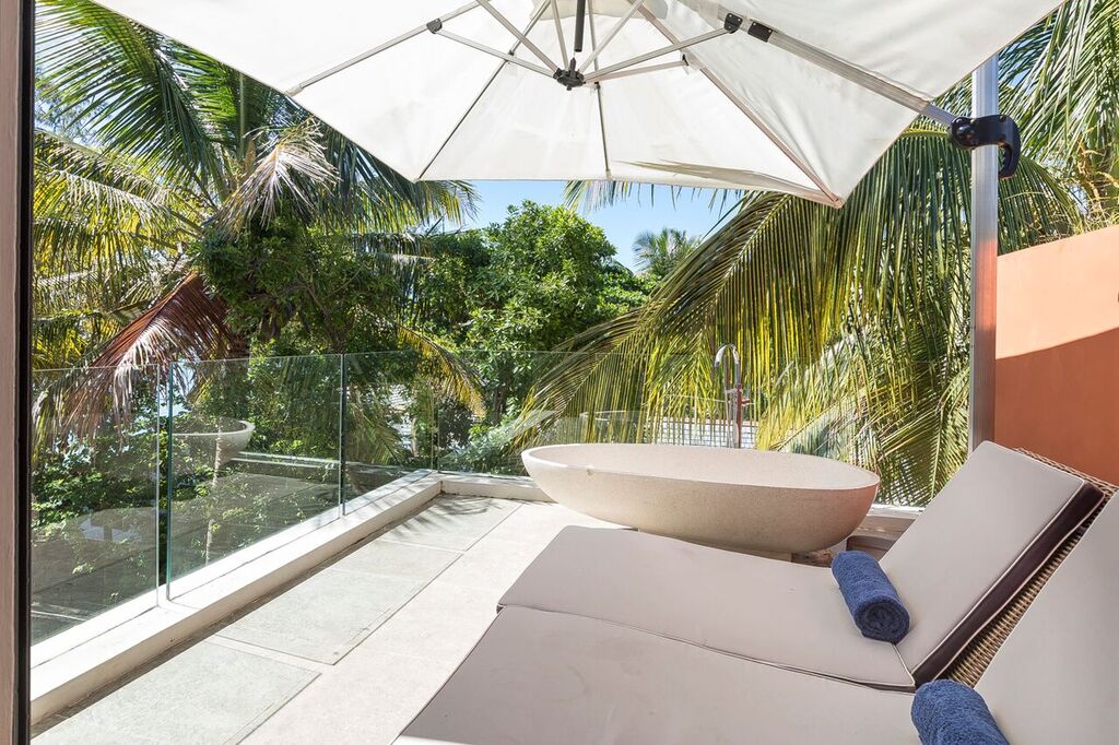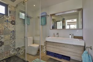 The master bedroom is en-suiteΒ and leads directly to a comfortable terrace where you can sun bath… or bath in the outside bath tub ! The second bedroom with a double bed is also en suite.Β