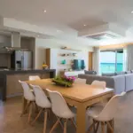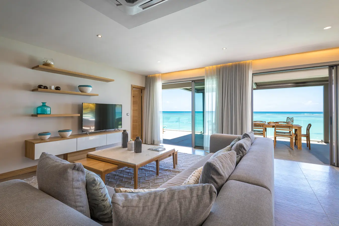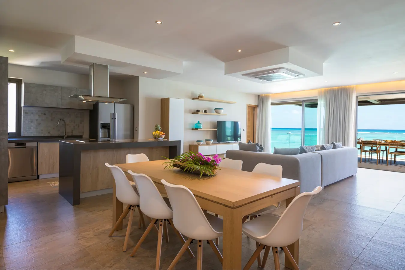 The living room, furnished and tastefully decorated, consists of a large comfortable living room with television, a large dining table and an open kitchen. Open the large sliding doors and enjoy the terrace and the breathtaking view over the Indian Ocean. You will never have enough of this!