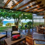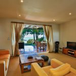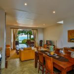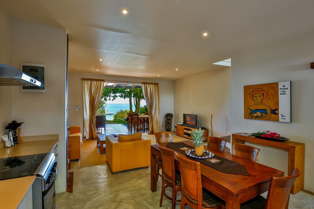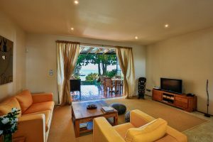 The living room with sliding glass doors offers a wonderful panorama view over the garden and the Indian Ocean just at your doorstep. Here you can comfortably rest or watch TV.