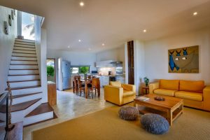When you enter this loft style apartment a nice and airy kitchen opens up on to the living room and out to your tropical garden and the sandy beach.