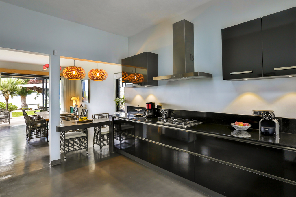 The first floor can accommodate 2 couples. The master bedroom has a double bed and the other bedroom has two single beds. There is a modern and clean bathroom and separated toilet. Both bedrooms lead to a balcony with a fantastic sea view. In the morning there is nothing more incredible than to wake up with such scenery.