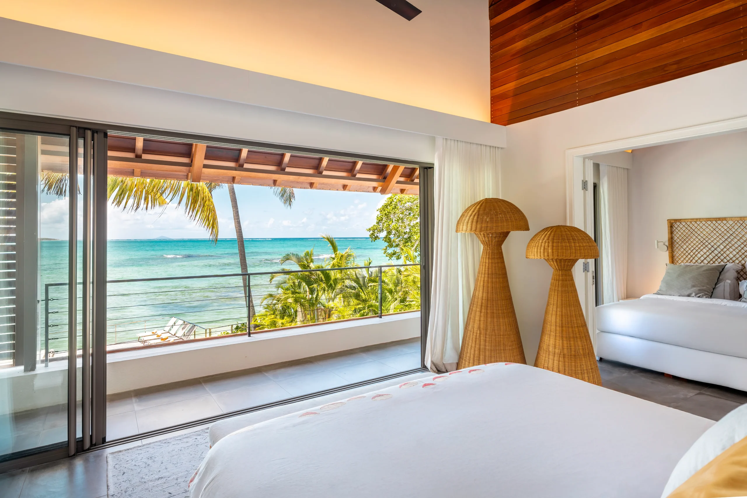 Mit 7 Schlafzimmern mit eigenem Bad (einschließlich eines Zimmers mit Verbindungstür, ideal für Familien) – von denen 3 einen atemberaubenden Blick auf das türkisfarbene Meer bieten – werden Sie jeden Morgen im Paradies aufwachen.