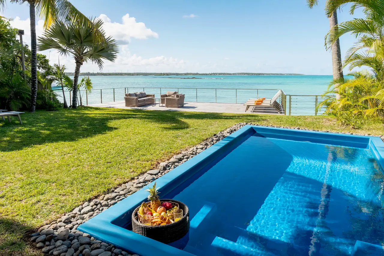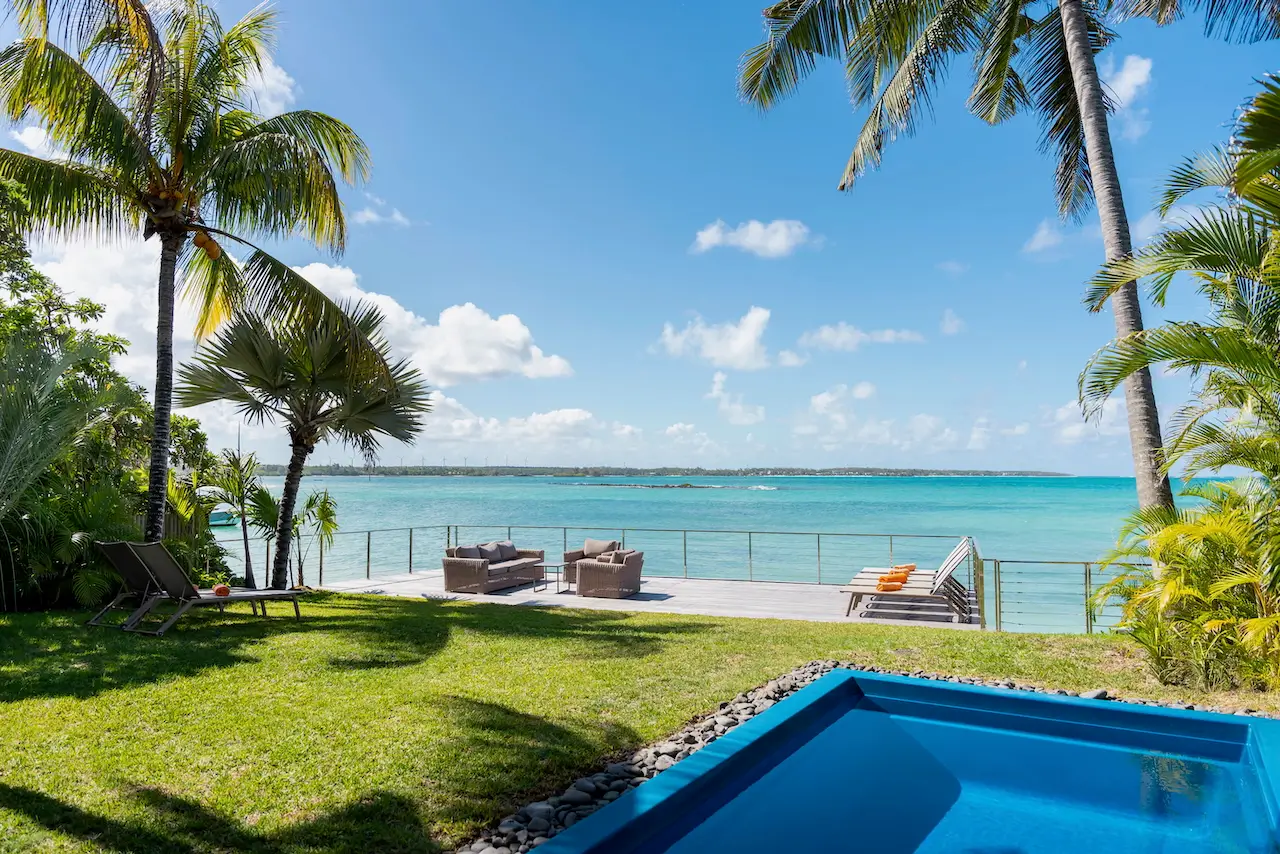 Bei der Villa RUBY & Saphir … dreht sich alles um Lage, Lage, Lage! Direkt am Rande der Lagune gelegen, bietet diese atemberaubende Villa einen Platz in der ersten Reihe mit Blick auf die malerische Küste von Mauritius. Treten Sie aus dem üppigen, großzügigen Garten heraus, und in wenigen Augenblicken stecken Sie Ihre Zehen in den weichen, pulverförmigen Sand.